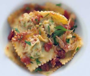 PREPARAZIONE: tritare lo stocco e impastarlo con le uova, il formaggio, gli spinaci, il pangrattato ed un trito di prezzemolo e aglio. Riempire con questo impasto i ravioli e bollirli in abbondante acqua. Scolarli per bene e condire con un sugo preparato a parte con un soffritto di cipolla e aglio, i pelati e le ventresche dello stocco.