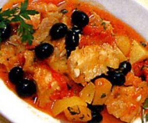 PREPARAZIONE: In un tegame di terracotta fate soffriggere nell’olio la cipolla affettata. Mettete poi i pelati e fate cuocere a fuoco lento per circa 5 minuti. Salate e aggiungete le patate a spicchi e dopo pochi minuti lo stocco a pezzi insieme alle olive e peperoni. Lasciare cuocere a fuoco lentissimo senza mescolare ma agitando l’intero tegame, per 20 minuti. Spegnere il fuoco e dopo aver fatto riposare per qualche minuto servire. A piacere si possono aggiungere con lo stocco le ventresche (trippiceji) del pescestocco.