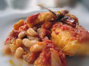 PREPARAZIONE: in un tegame di terracotta soffriggere nell’olio la cipolla tritata ed il peperoncino a pezzetti. Quindi aggiungere i pelati ed al primo bollore mettere lo stocco a pezzi. A cottura ultimata mettere lo stocco con il sugo in una zuppiera e aggiungere i fagioli cotti in precedenza in una pignatta di terracotta. Servire in scodelle di terracotta.